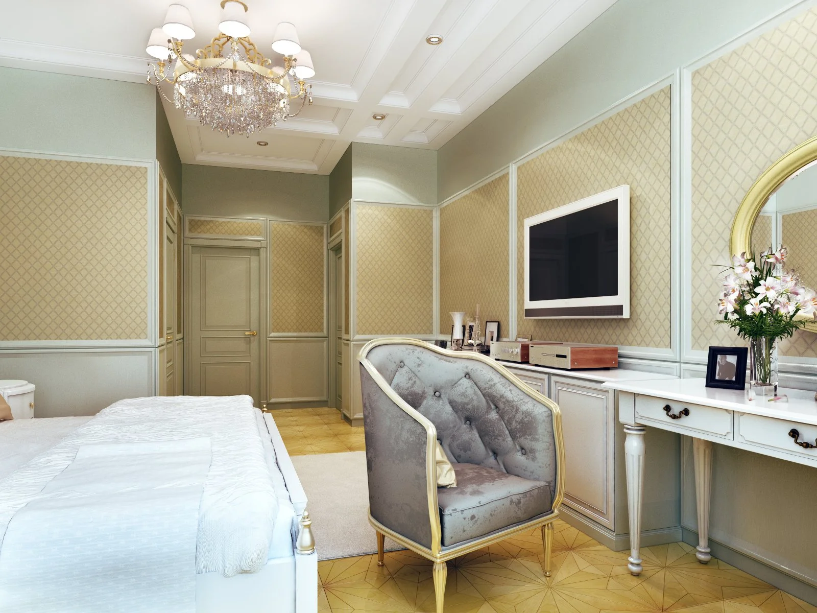 Extras: Hardwood floors, patterned rugs, traditional chandeliers, mouldings, ceiling roses, and smart storage.